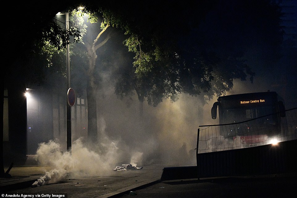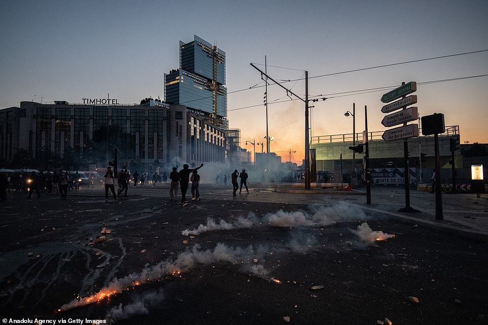 Huge crowds turned up undeterred by the police warning, and by 9.30pm fires had been lit underneath the Boulevard Périphérique, the ring road around the French capital The junction outside the Timhotel was left filled with tear gas after the protests soon unravelled into rioting, with demonstrators lighting bonfires and clashing with officers