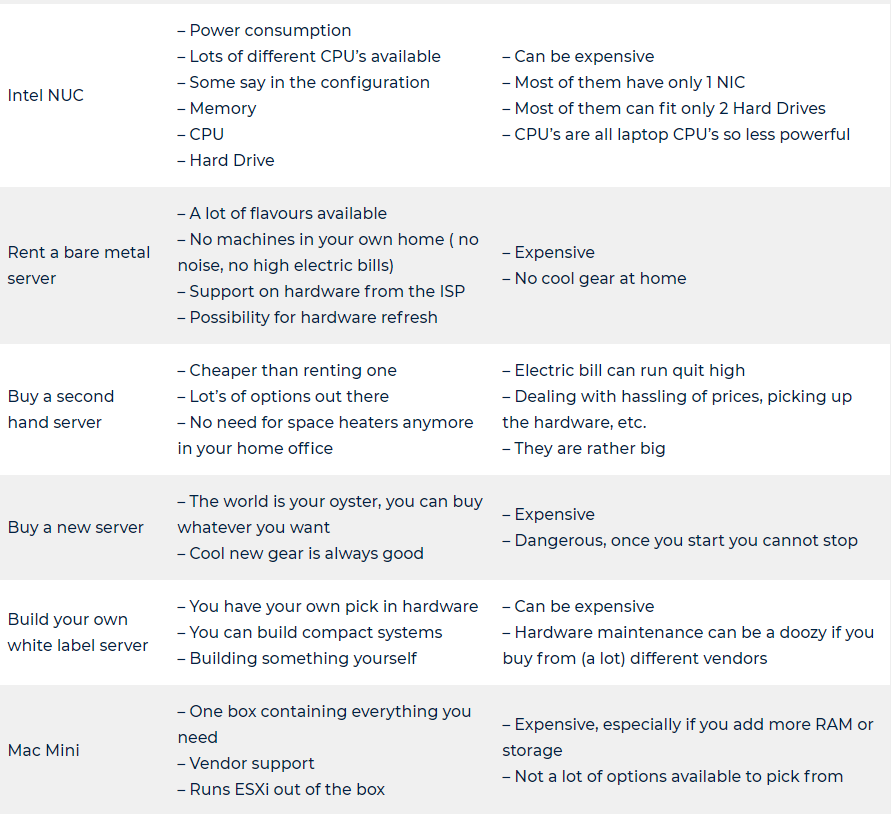 The hardware will form the bases of your VMware based homelab but first of all, sit back and think about what you want to do with your VMware based homelab. Buying the most expensive, biggest, best hardware money can buy does not make a lot of sense if you only want to host a couple of containers. Maybe you would be better of gettings a Raspberry PI in that case.