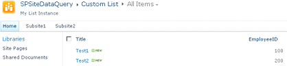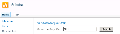 In the Subsite1 I have created a web part "SPSiteDataQuery WP" and I have created one subsite called "Test".