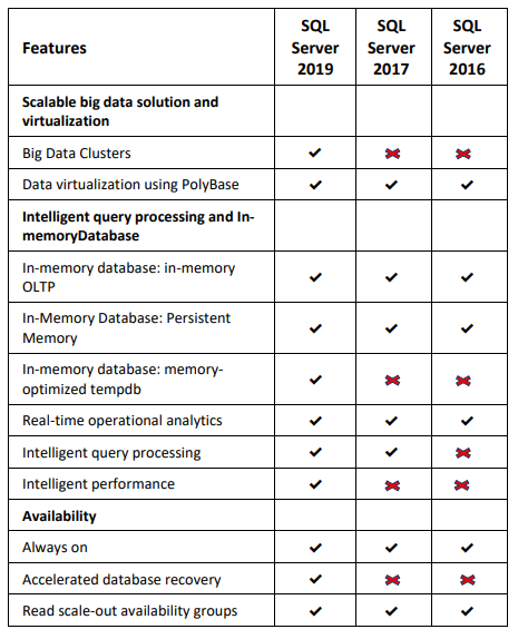 Applications are getting the update nowadays. Microsoft is adding some new features in SQL server and has just released a version of SQL Server 2019 (15.x). Compared to the previous version, (i.e. SQL Server 2016 and 2017), SQL Server 2019 (15.x) has some new and valuable features. This new edition of SQL server provides Big Data Clusters for SQL Server. It also provides additional capabilities and improvements for the SQL Server database engine, SQL Server Analysis Services, SQL Server Machine Learning Services, SQL Server on Linux, and SQL Server Master Data Services.