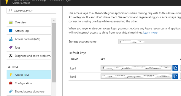 From the Azure Table Storage, account name and access keys need to be noted and used in the node application for accessing the Azure Storage data.